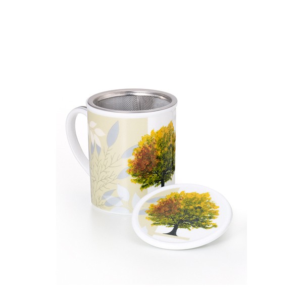 Taza de porcelana con colador de acero, ideal para una buena preparación de té o infusión.